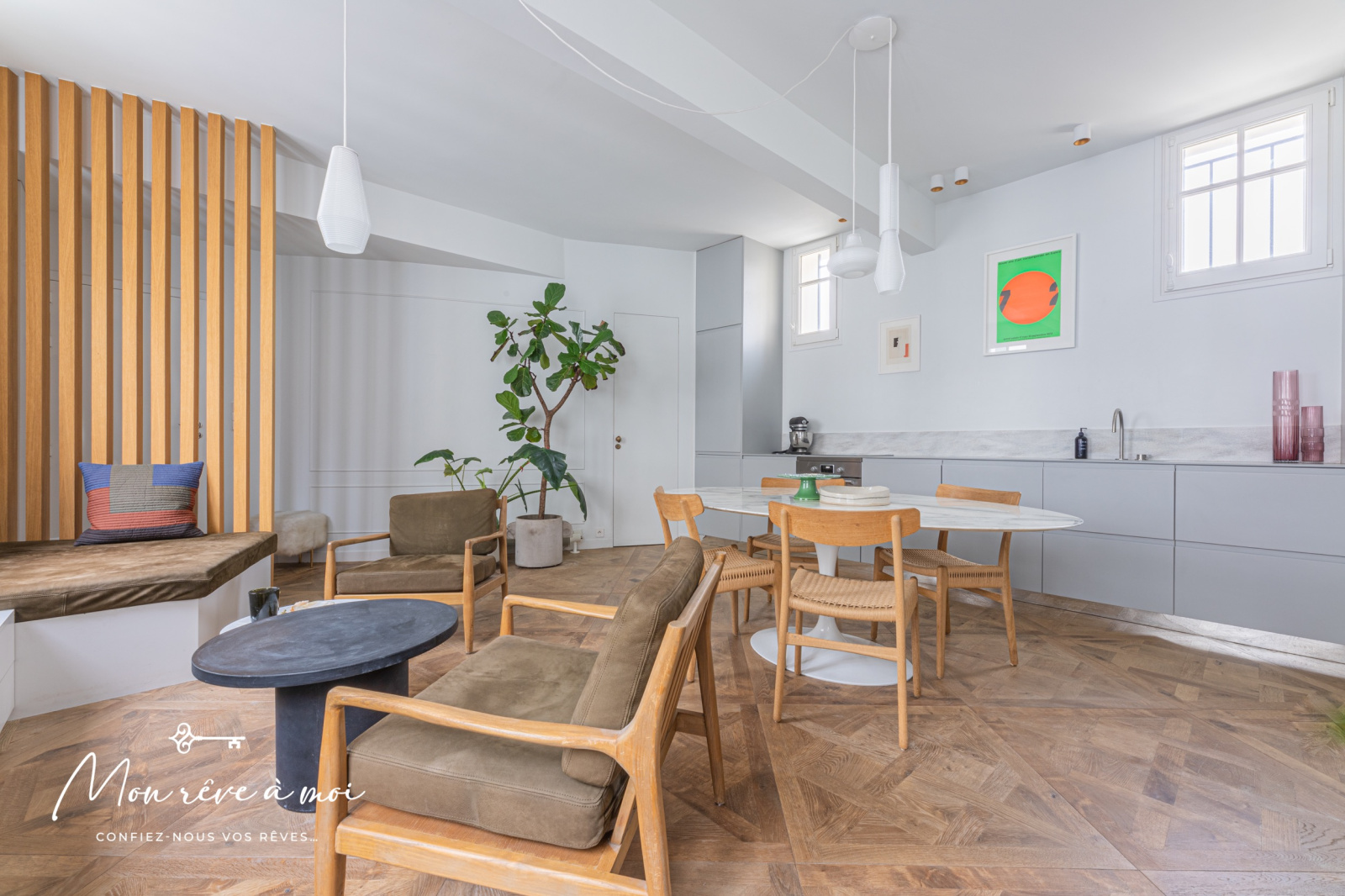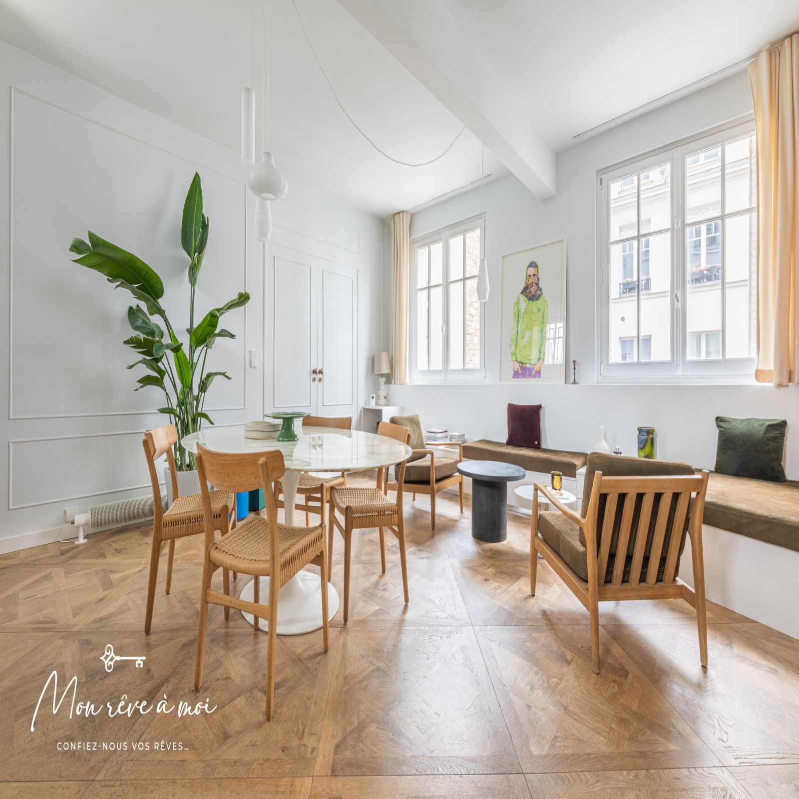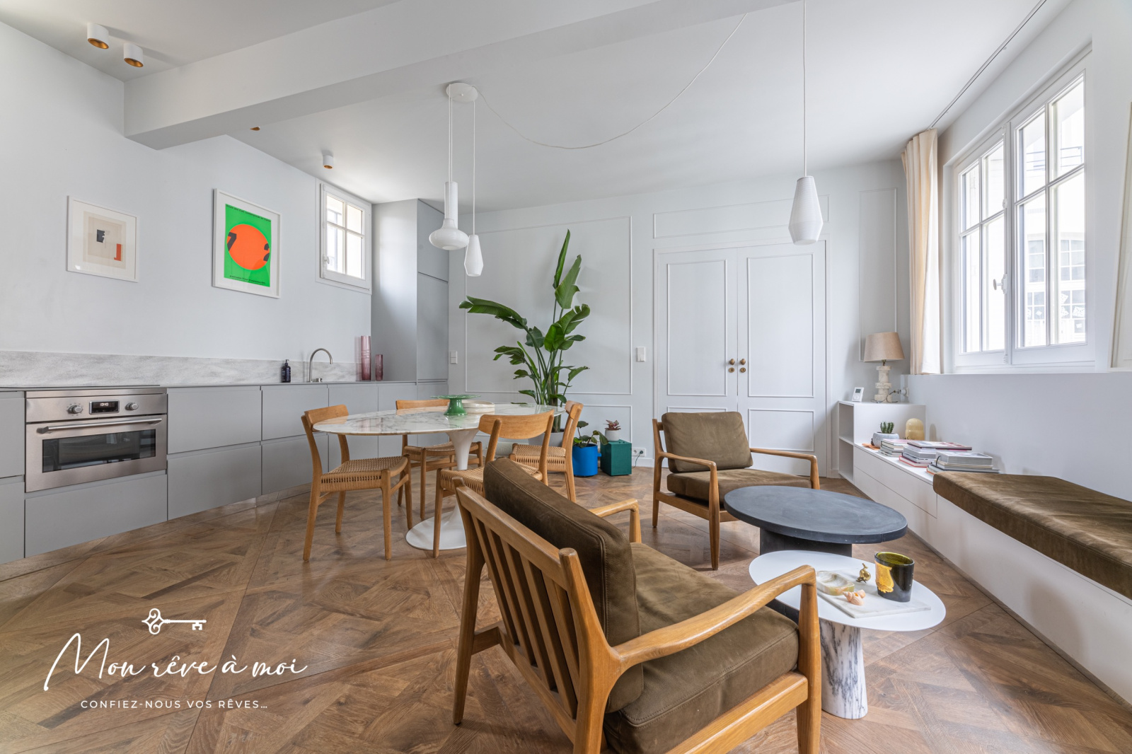 Mon rêve à moi, 10 ans d'expérience et une commission fixe de 6 500 € vous propose à la vente et en exclusivité, cet appartement 2 pièces de 54m² (52,59 Loi Carrez) intégralement rénové par architecte, au sein d’un immeuble bien entretenu de 1800, à proximité immédiate des commerces et des transports.