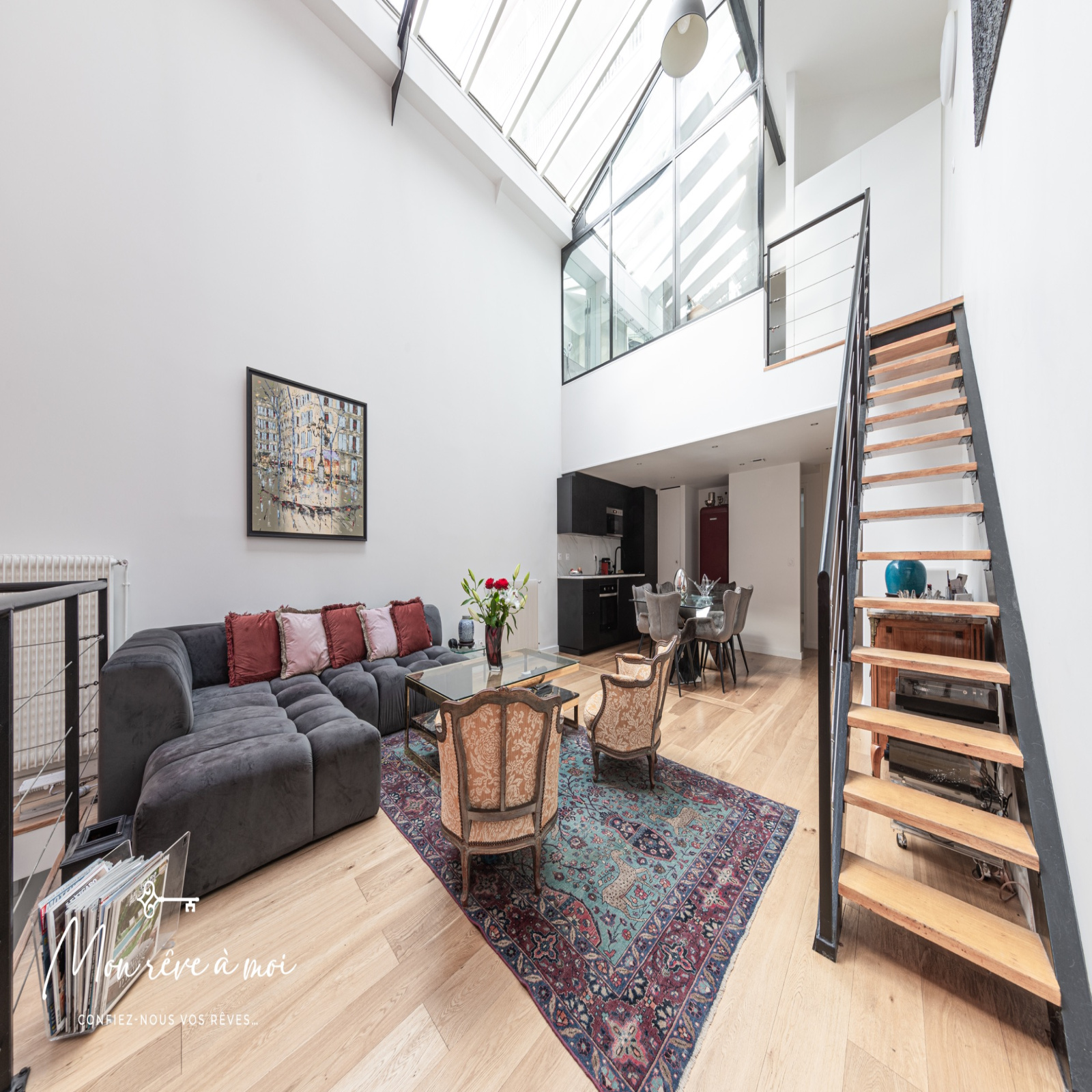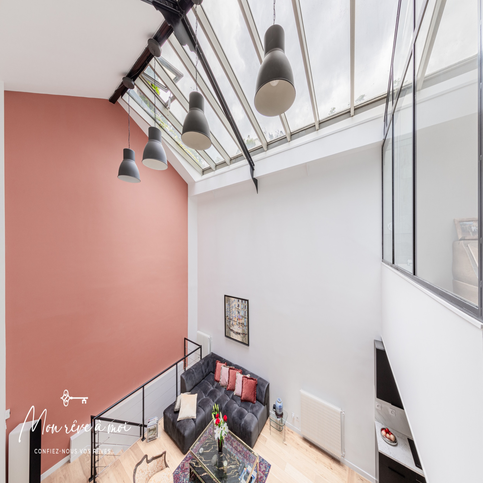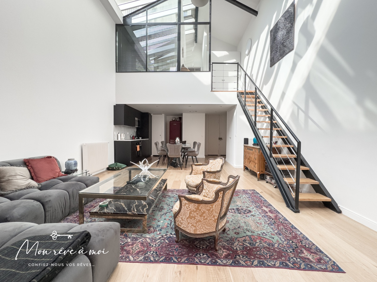 Au rez-de-chaussée, d’un séjour cathédrale (6,20m d’hauteur sous plafond) de 46m² incluant une cuisine ouverte, aménagée et équipée, d’une chambre de 15m², d’une salle d’eau avec WC ainsi que d’un dressing/buanderie.