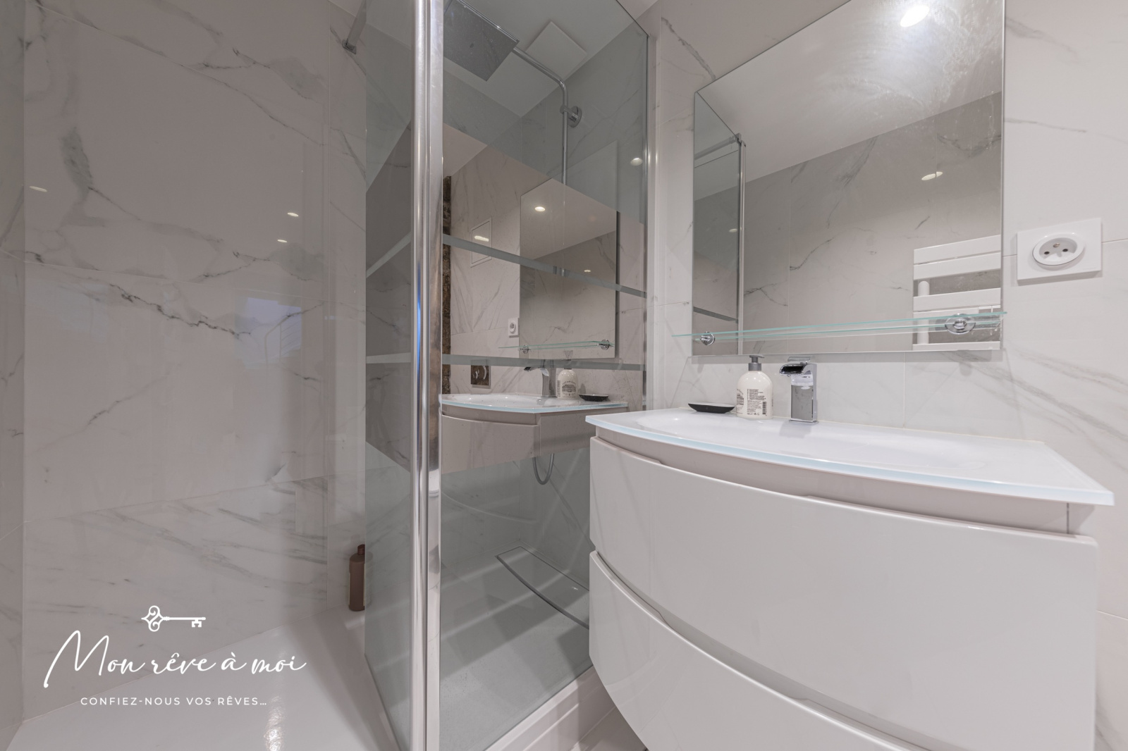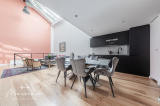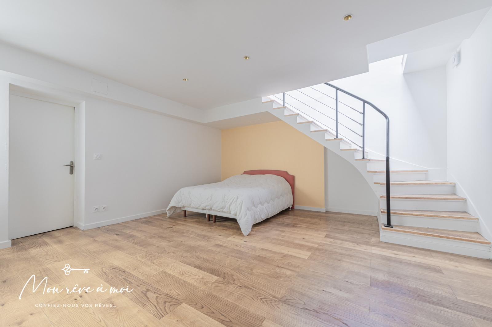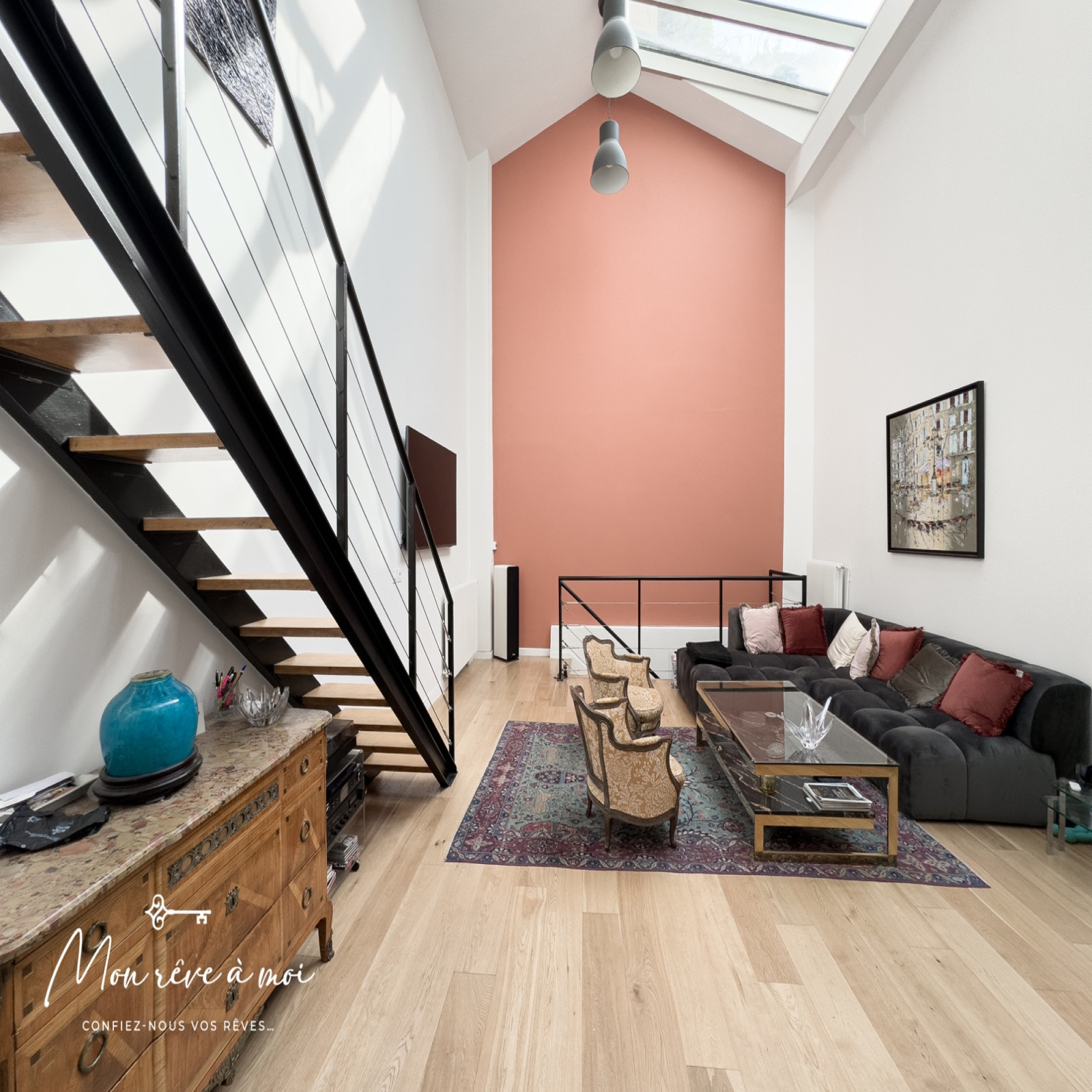 Au rez-de-chaussée, d’un séjour cathédrale (6,20m d’hauteur sous plafond) de 46m² incluant une cuisine ouverte, aménagée et équipée, d’une chambre de 15m², d’une salle d’eau avec WC ainsi que d’un dressing/buanderie.