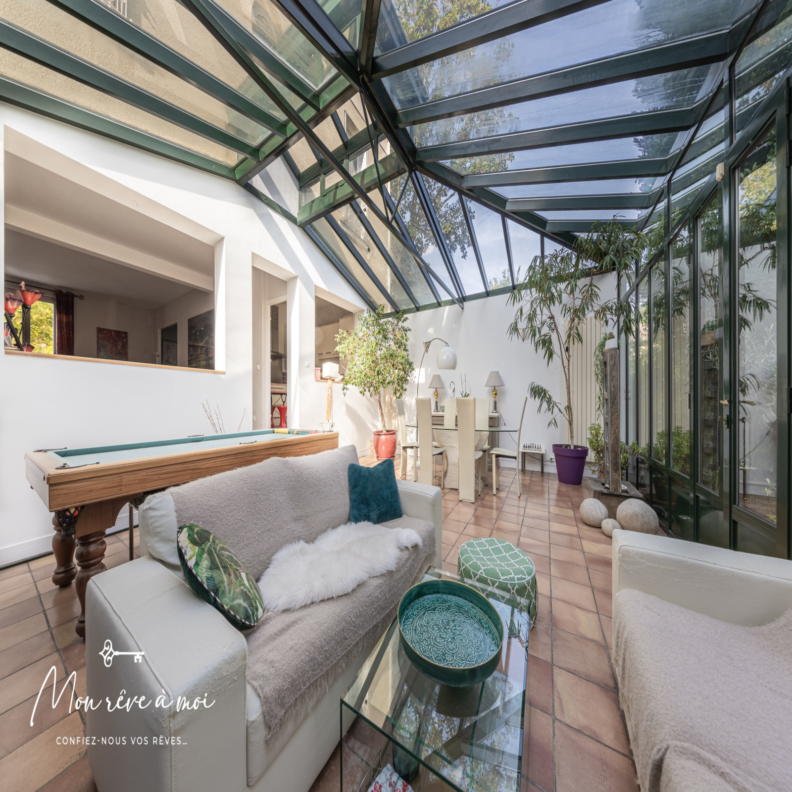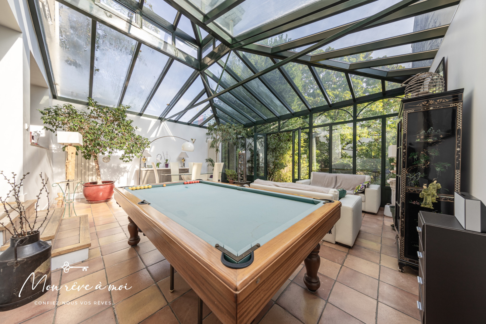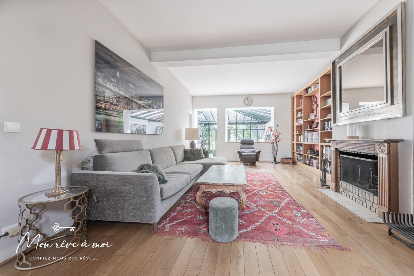 Au rez-de-jardin: d’une entrée avec rangements, d’un double séjour de 31m² ouvrant sur une véranda de 44m² baignée de lumière ainsi que d'une cuisine semi-ouverte.