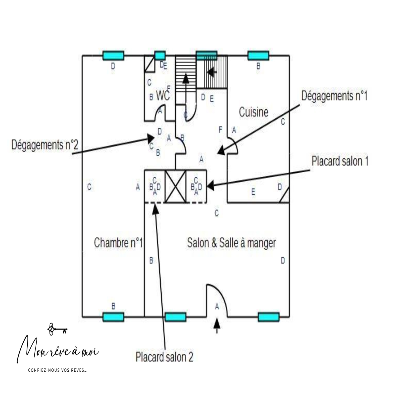 – Au 1er étage: d’un double séjour de 30m², d’une cuisine dinatoire, séparée et aménagée, d’une chambre de 18m² ainsi que d’un WC indépendant.