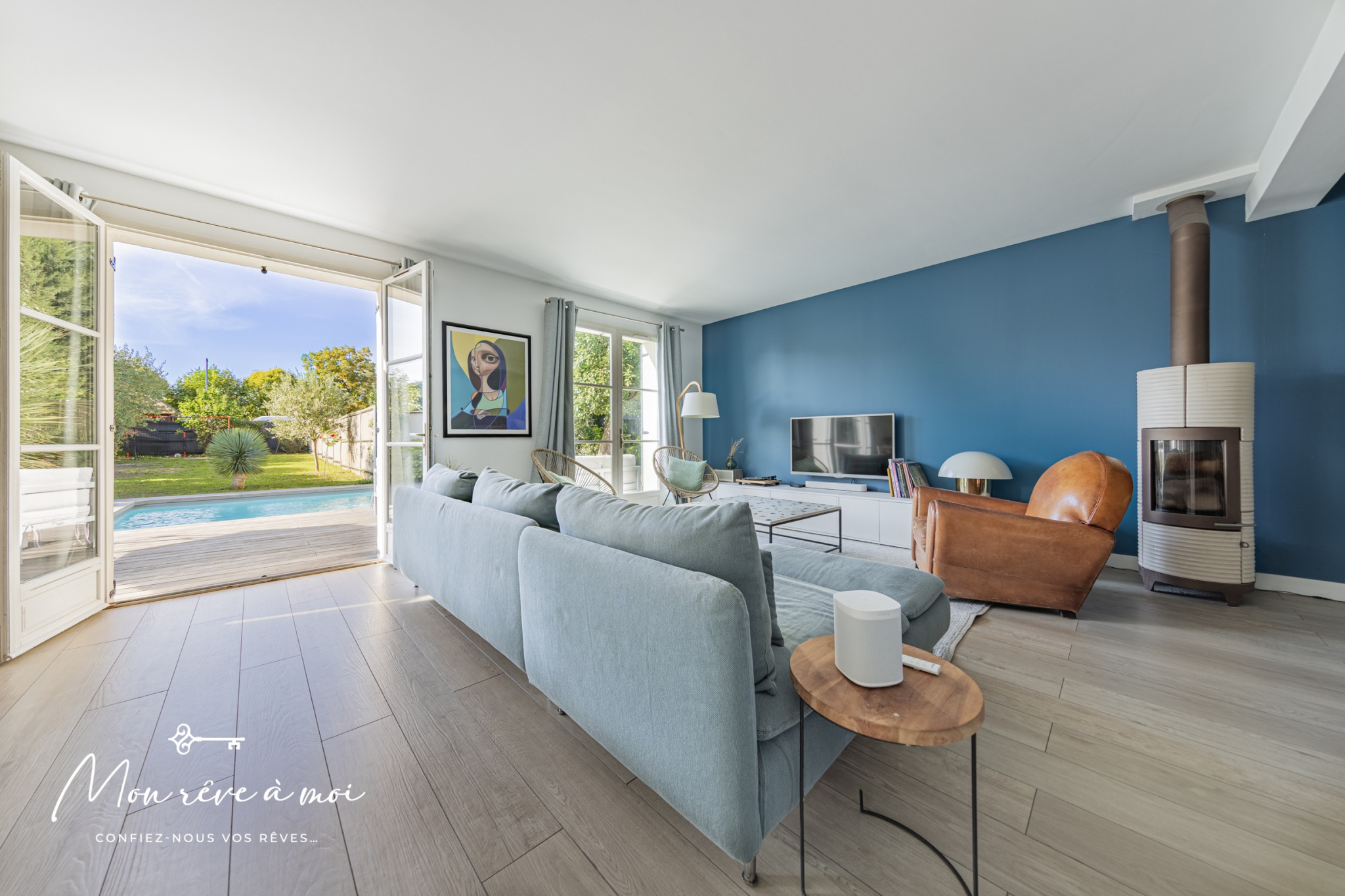 Au rez-de-chaussée, d’un double séjour de 57m² donnant accès à un jardin avec terrasse et piscine, d’une cuisine dinatoire ouverte, aménagée et équipée, d’un WC indépendant ainsi que d’un box avec accès direct à la maison (seconde place devant la maison).