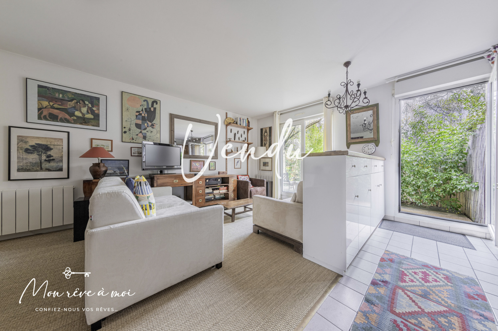 d’une grande pièce de vie de 30m² incluant le séjour, la salle à manger et la cuisine ouverte (aménagée et équipée), l'ensemble donne accès au jardin privatif et aux terrasses ensoleillées, d'une chambre avec rangements, d'une salle de bains ainsi que d’un WC indépendant.